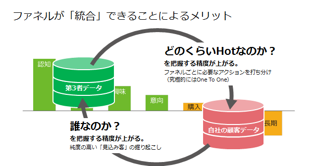 広告・プロモーションとCRMのファネルを統合することが「フルファネル」で、広告・プロモーションの「認知」からCRMの「長期」までをとらえることを指します。では、2つのファネルを統合したフルファネルにすると、どのようなメリットが生まれるのでしょうか。広告・プロモーションでは、第三者データを使い、CRMでは自社の顧客データを活用します。フルファネルによって、それぞれのデータをつなぐことで、広告・プロモーションでは〝純度〞の高い見込み客の掘り起こしが可能になります。一方、CRMでは顧客にピンポイントでアプローチできたりといったことが期待できます。このように、広告・プロモーション、CRMのそれぞれで目的を果たす確率や精度が上がります。