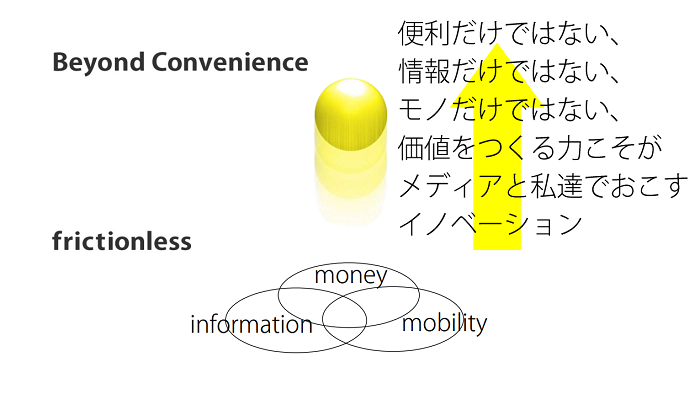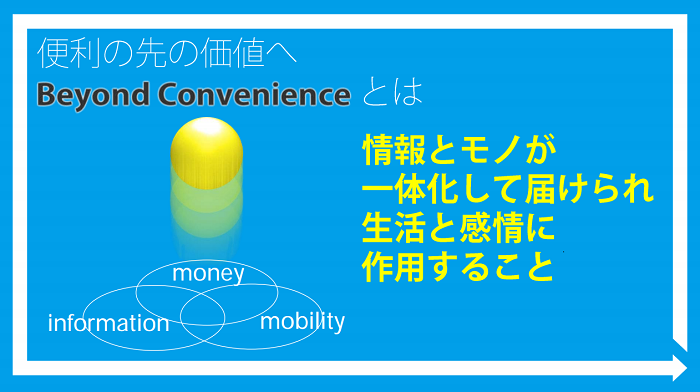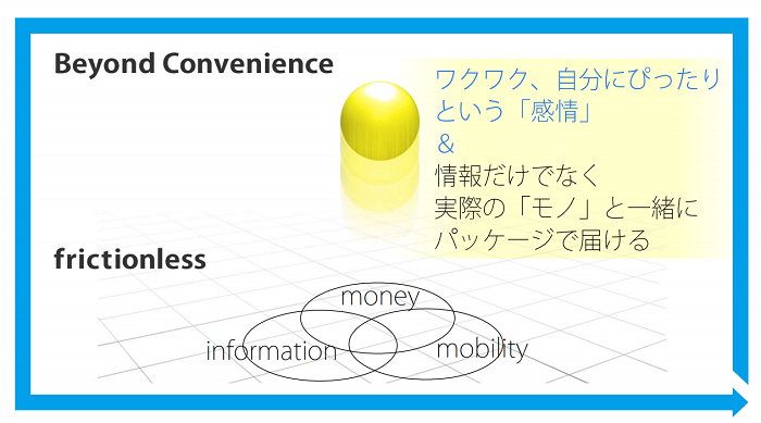 便利の先の価値のつくり方についてですが、個別の便利ではなく、混ざり合うからフリクションレスになると考えます。情報とモノが一体化し、生活を編集して届けることが価値になります。