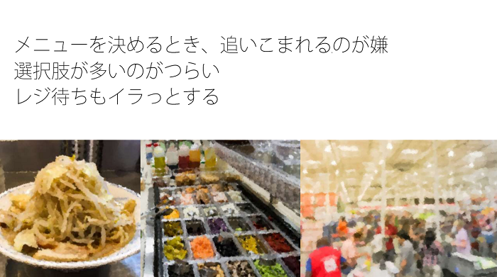 今年の春先に大学生30人にワークショップなどを通じてインタビューしていた際に、こんな話がでました。あるラーメン屋さんでは注文をする際、自分の好みをスムーズに伝えないと店員さんから急かされたりするそうなのですが、そういうことが嫌だという発言が出ました。同じような話で、あるサンドイッチ店は具を選ぶ選択肢が多すぎるとか、混雑しているスーパーやコンビニのレジ待ちが辛い、という話が多く出てきました。