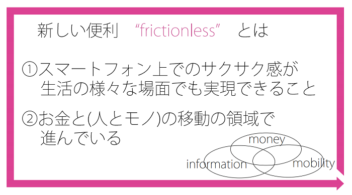 本日は2つのパートでお話したいと思っています。1つ目は生活のデジタル化による“新しい便利”です。「フリクションレス」という言葉でそれを表現していまして、フリクション=摩擦がなくなるといろいろなことがサクサク進むという事例をご紹介したいと思います。