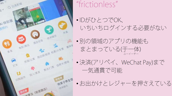 「美団点評(Meituan)」というアプリを使っている上海在住の23歳の女性にインタビューしました。このアプリの中にチケッティングや飲食店レビュー、出前、配車サービス、民泊サービスなどのさまざまな機能が詰まっています。日本だと個別のアプリを立ち上げる必要があるような機能が、ひとつのアプリでできるということです。中国では、ミニプログラムという仕組みがあって、アプリの中にアプリが埋め込まれているんです。