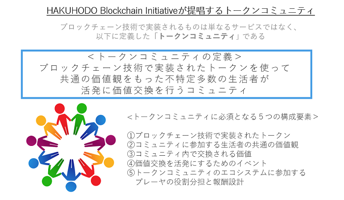 一般的にはトークン“エコノミー”という言葉がありますが、これはブロックチェーンによって実装した経済的な価値を付与したトークンによって“商圏”が形成されることを意味しています。しかし、我々HBIはブロックチェーンによって実装されるトークンは経済的な価値に限定されることはなく、感謝価値、称賛価値など生活者が価値を感じるあらゆるものに適用できると考えており、それによって形成されるのは、“商圏”ではなく“共通の価値観を持つ共同体”つまりコミュニティであると捉えて、「トークンコミュニティ」という言葉を独自に提唱しています。