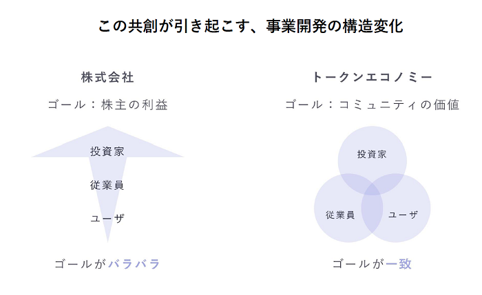 株式会社の場合、どうしても株主の利益がゴールになってしまいます。その場合、ユーザーや従業員には価値があるサービスでも、ビジネスとして成長しないからサービスを閉じよう、ということが起きてしまいます。一方、トークンエコノミーは、投資家とユーザーと従業員のゴールが「コミュニティの価値を上げること」で一致しているため、凄く活発にコミュニティが動きます。