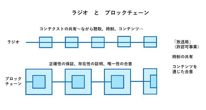 こういうことを考えていて、ラジオとブロックチェーンは似ているところがあるなと思いました。ラジオはコンテクストを共有します。仕事や家事中の「ながら聴取」で時制を共有し、コンテンツを通じて合意を得ます。これは、ブロックチェーンにおける、正確性の保証や唯一性の合意などの前提と共通するように思います。