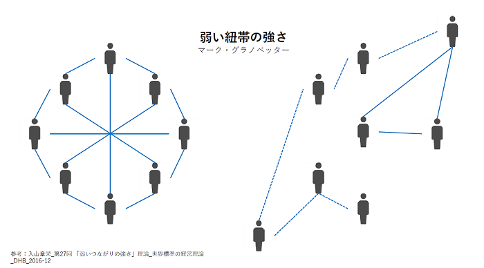 解決のヒントになるのが、マーク・グラノベッターが提唱している「弱い紐帯の強さ」です。一般的なコミュニティが図の左のようになっているとしたら、弱い紐帯は右のようになっています。線が長く伸びている分、遠くの知恵との出会いがあります。これは、イノベーションの前提でもあります。