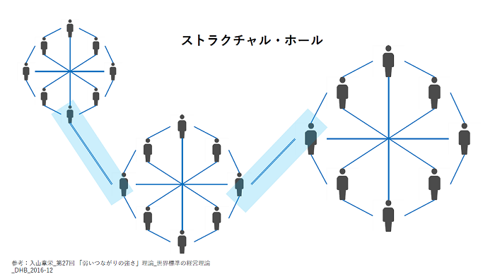 杉本:ブロックチェーンなどが登場した現在の状況で、メディアは何ができるのかということが問われていると思います。これまでメディア側が情報を持って一方的に配信するという、情報の非対称性に依拠したビジネスをしてきましたが、情報の価値は相対的に下がってきています。たとえば、この「ストラクチャル・ホール」の図のように、コミュニティを超えて繋がれる素、種を提供するような、トランザクションを最適化する役割を担うのも一つではないかと思っています。