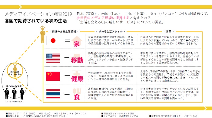 続いて、今年7月に発表した「メディアイノベーション調査2019」の結果について。日本(東京)、米国(L.A.)、中国(上海)、タイ(バンコク)の4か国4都市において、次世代のメディア環境に連携すると考えられる「生活を変える81の新しいサービス」についての意識調査の結果を紹介しました。(プレスリリースはこちら)