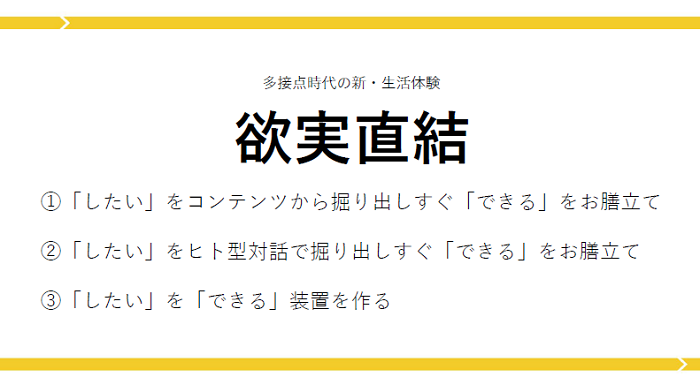 さらに、生活シーンのデジタル化が進み、多様な接点が生まれていくなか、これからのビジネスに重要な視点として「欲実直結」というキーワードを挙げました。情報体験を通じて、顕在化していない生活者の欲求を、「買える」「できる」「行ける」などの“実行”と直結させることがこれからのビジネスにおいて重要な視点である可能性を示唆しました。