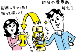 大学生協のカフェで次の授業までお茶をしている学生の康介さんと綾さん。「昨日の世界新、本当にすごかったよな~」。康介さんは競泳男子100 m平泳ぎ決勝の余韻に浸っている。「えっ?私、見逃しちゃった、見たかったな~」。綾さんは、康介さんの話を聞いて悔しがる。「映像あるよ。あげるよ!」康介さんはスマホを取り出し、綾さんのスマホに向けてシェイク。綾さんのスマホに映像が瞬時にダウンロードされる。