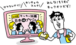 終業後、脇目も振らず帰宅したサッカーファンの圭佑さん。今夜は男子サッカーの決勝戦、日本vs.ブラジルだ。家のソファに座ってテレビをつけログインすると、そこにはさまざまな国籍のアバターたちが既に観戦準備。あわてて自分もアバターの輪に加わる。ホイッスルが鳴り響き、遂に試合がスタート。試合を楽しみながら、アバター同士でワイワイと会話。言語が違っても自動翻訳だから感動も一緒に分かち合える。