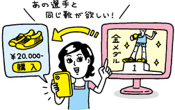 テレビで女子マラソンの表彰式を見ているアラフォー主婦の尚子さん。表彰台でガッツポーズをとるアスリートのシューズに一目ぼれ。「日課のランニングで履きたいな…」。テレビのリモコン機能を搭載した手元のスマホに、「優勝者のシューズ!」と話しかけると、シューズの画像と購入ボタンが表示される。「ちょっと高いけど、やっぱりクールでカッコいい。買っちゃおうっと。商品が届くのが待ち遠しいわ」。