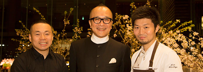 左から、フラワーアーティストの赤井勝氏、ホストを務めた山田五郎氏、シェフの長谷川在佑氏