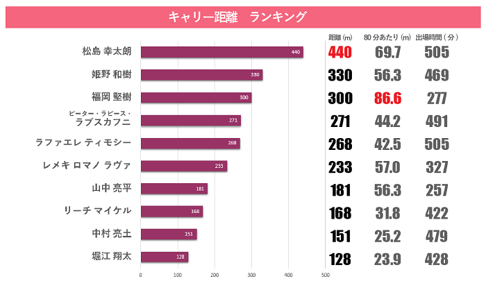 ただ、今大会は積極的に外側へ大きく振り、そこへ松島幸太朗選手など優秀なランナーを配置し、積極的に進めていく戦術に変わりました。実際に、松島選手はキャリー距離が440mとチームトップ、大会全体で見てもトップクラスです(図5)。特筆すべきは出場時間が短かった福岡堅樹選手の277mで、80分あたりの距離に換算するとチームトップです。