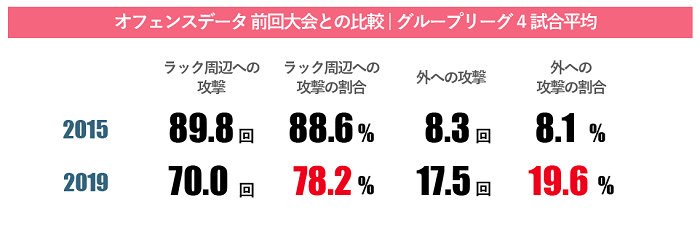 まず、ディフェンス面でいうと、今大会はタックルを中心にしたディフェンスがうまく機能していました。4年前と比べて、タックルの成功率が上がっています。予選プール4試合平均で85.9%だったのが、91.5%と向上しました(図1)。
