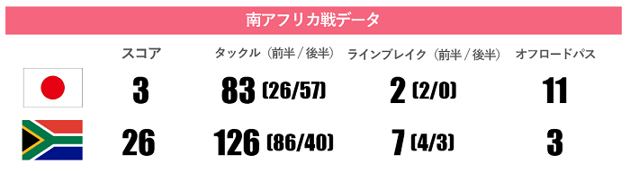 敗れてしまったベスト8の南アフリカ戦を検証すると、ボールキャリーの平均距離が予選プール4試合平均の752mと比較すると444mと大幅に減少し、特に試合後半で激減していました。予選プールまでは試合後半に全体的な数値が伸びる傾向にあったことを思うと、この試合は疲労の蓄積もあり、後半で体力切れを起こしたのだろうと想像できます。