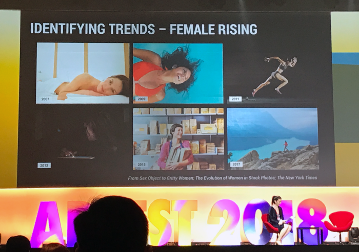 その中でも盛況だったのが、Getty Imagesの、「VISUAL TRENDS & SHIFTING SOCIETAL PERCEPTION」。自社のプラットフォームでダウンロードされた写真のトレンドから、世の中のトレンドを読み解くというテーマのもと、実際にどのような写真がダウンロードされているかのアクチュアルデータを交えつつ、事例が紹介されていました。“写真のダウンロード”というビッグデータ活用の可能性を示唆するものとなりました。