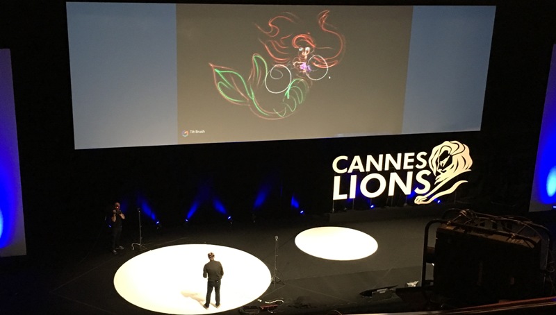 今回の「Cannes Lions」でも、多くのセミナーやブースで「VR」(Virtual Reality)がフォーカスされています。中でも21日に行われたGoogleによるセミナー「Adventures in Virtual Reality」では、会場ステージで実際に「VR」を活用した空間アートペインティングの実演がありました。”空間上にVRで絵を描く”という、新しいテクノロジー体験によって、観客席からは大きな拍手と喝采が起こっていました。