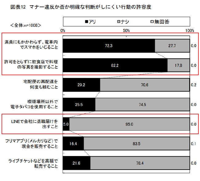 調査では、公共の場におけるマナーに関する一般常識や知識は兼ね備えている一方で、スマホ利用やSNSにおけるコミュニケーションを中心に世間とは異なるマナー観を持っていて、マナー違反か否か明確な判断がしにくい行動に対しても独自の判断基準をもっていることが明らかになりました。