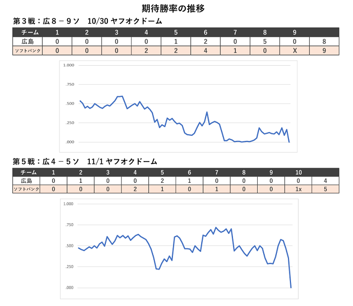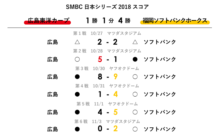 今年の日本シリーズの結果は、ソフトバンクの4勝1敗1分けでした。この結果だけ見るとソフトバンクの圧勝ですが、それぞれの試合は接戦が多く、ちょっとしたことで結果が変わっていても不思議ではなかったシリーズだったといえます。
