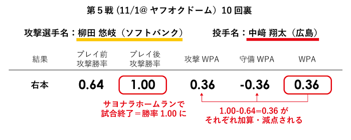 たとえば第5戦の10回裏、ソフトバンクの柳田悠岐選手が打席に入ったシチュエーションでの勝利確率は0.64。それがサヨナラホームランで勝利が決まったので勝利確率は1.00になり、その差の0.36が柳田選手のWPAにプラスされ、打たれた広島の中﨑翔太投手には逆に-0.36がつきます。このようなシチュエーションごとのプラス・マイナスの数字を合算したものが、それぞれの選手の日本シリーズのWPAになります。
