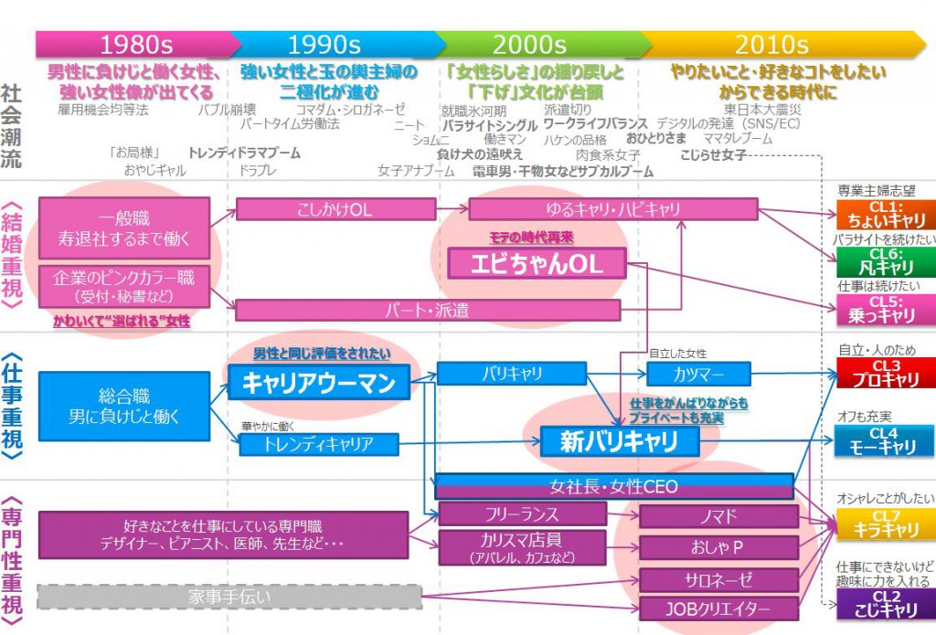 2000年代に、フリーランス、カリスマ店員、おしゃP、ノマド、サロネーゼなど新しい働き方を開発した種類は、「キラキャリ」として進化した。