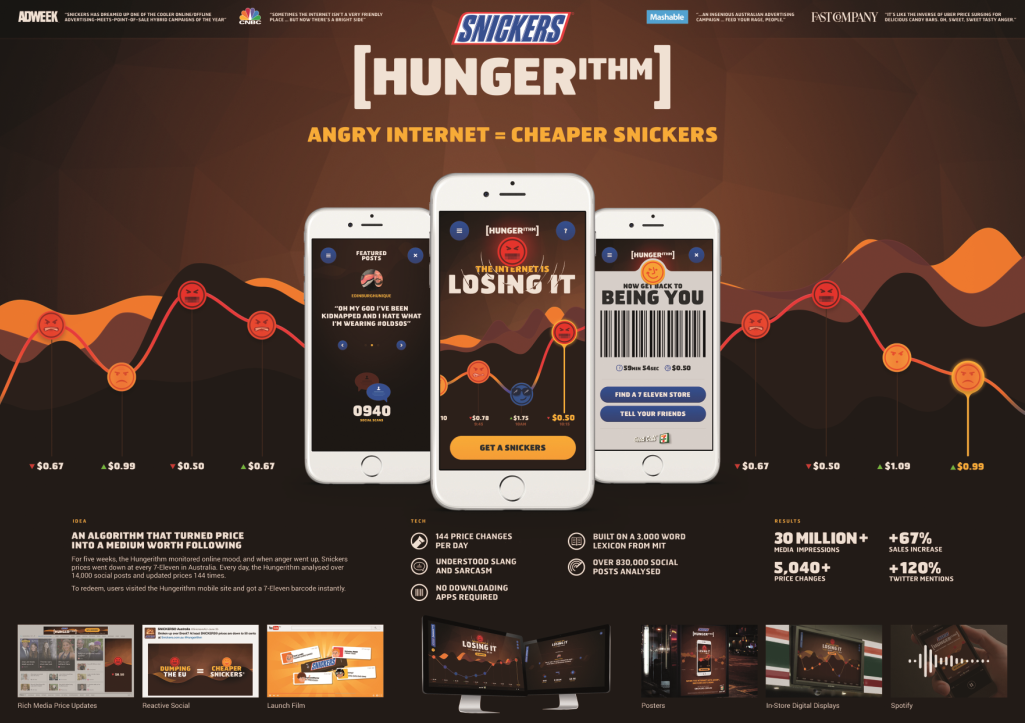 グランプリに輝いた『Hungerithm(Mars)』は「スニッカーズ」らしい、ちょっと“やんちゃ”な(?)キャンペーンです。ソーシャルメディア上に現れる“怒り”をリアルタイムに計測し、その動きに合わせて販売価格を変動させるというアイデアを、メディア/データ&テクノロジー/流通のコラボレーションによって実現させました。マーケティングをトランスフォームするメディアの可能性を示し、さまざまな業種のすべてのマーケッターをモチベートする“強さ”があるということが栄冠の決め手になったと思います。(Hungerithmはモバイル部門でもグランプリを獲得しました)