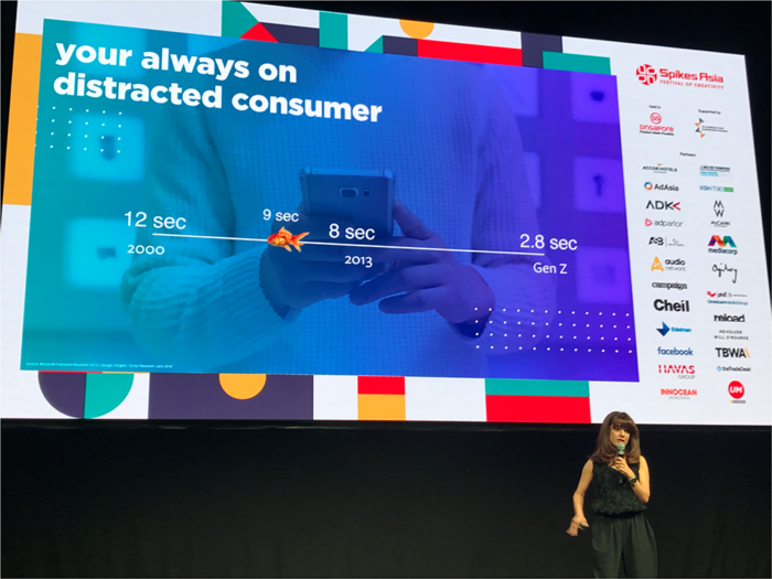 さらに、一般的に人の集中力が8秒、若年層に限っては2.8秒(対して金魚は9秒!)まで短くなっていると言われるこの時代に、動画の尺は重要なファクターであると説明していました。“小さなスクリーンで、短い尺の動画だからこそ、興味を引きつけるためにBIG IDEAが必要だ”という内容が話され、短尺+BIG IDEAでブランドコミュニケーションを成功させた事例を多数紹介。大勢の観客から拍手喝采を浴びていました。