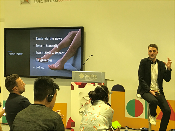 スモールバジェットキャンペーンをニュース番組から急速に拡散したこと(scale via the news)、自動車事故に関するデータを人々の興味を強烈に惹きつける文脈に変換したこと(data+humanity)など、5つのエッセンスが紹介されていました。