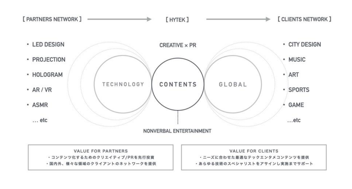 HYTEK はテックベンチャーの保有する高い技術力と、博報堂DYグループの持つクリエイティブ・PR力を掛け合わせ、AR/VR技術やホログラム、プロジェクション、LED造作などの最先端テクノロジーを活用した非言語のコンテンツを共創し、グローバルでの新しいエンターテインメントの展開を目指します。
