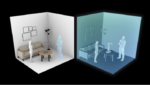 左、現実空間において、ARユーザーの視点から、遠隔地のVRユーザーのアバターがあたかも目の前に見えているイメージ