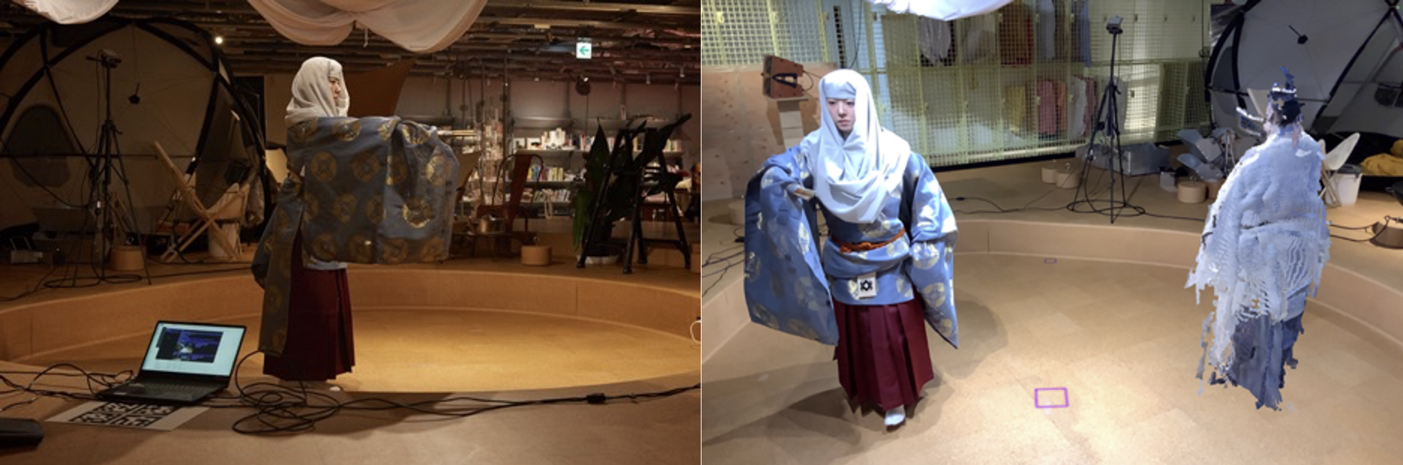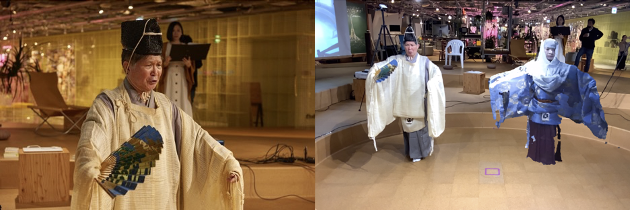 右:リアルタイムに転送された右側のボリュメトリックビデオの演者(シテ)との共演(ARデバイスの視聴イメージ)