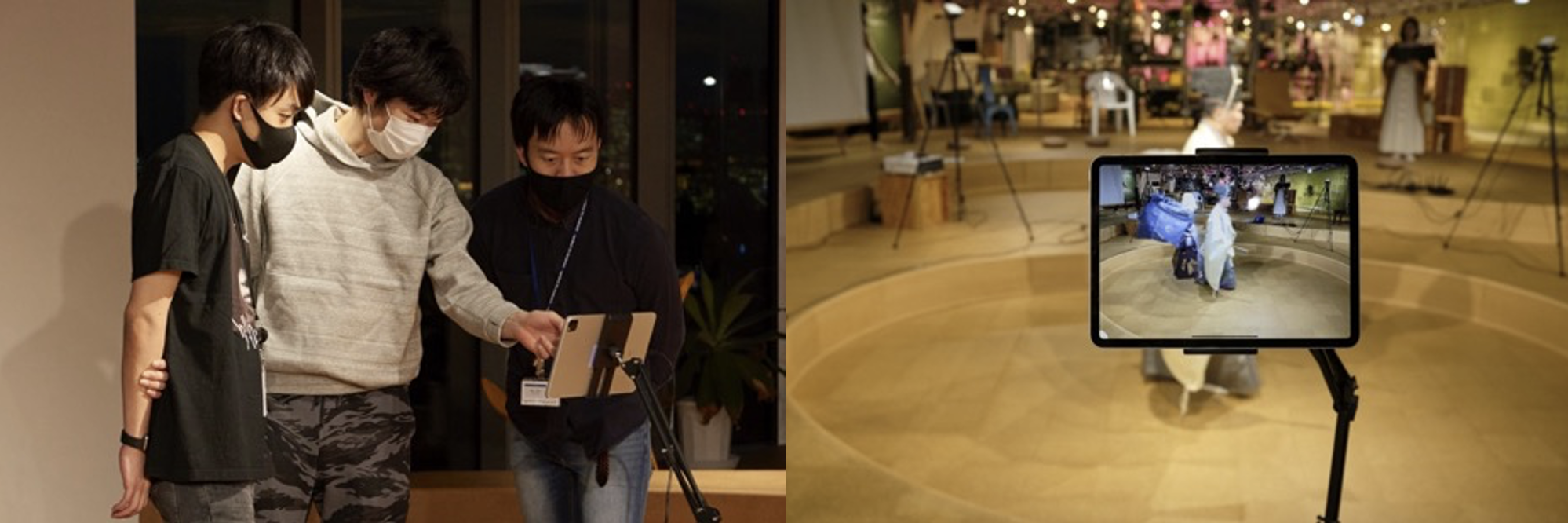 通常、高品質なボリュメトリックビデオの撮影には専用のスタジオが必要で、リアルタイム配信・鑑賞にも高価な専用機材が必要ですが、今回の実験では持ち運びが可能な機材セットと一般に生活者が保有するタブレット端末にて実験を行い、現状の技術的課題を明らかにすると同時に、実際のイベントを想定した際の運用面で必要な体制やボリュメトリックビデオ撮影時の機材配置やオペレーション確認を行いました。