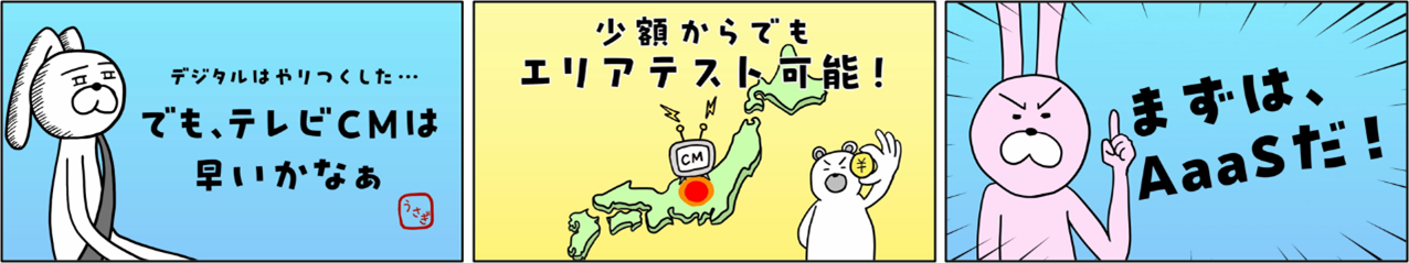 「テレビCMはまだ早いかなあ…」と悩みを抱えるウサギ社長に、少額からでもエリアテストが可能な「テレビCMトライアルパッケージ」が紹介され、ウサギが「やってみよう」と決意を固める『まずはAaaSだ』篇ほか3篇を放映します。