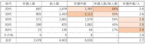 一人あたりの申請件数は、60代が最も多く2.9件、次いで50代、40代が2.8件と年代が上がるごとに微増傾向。