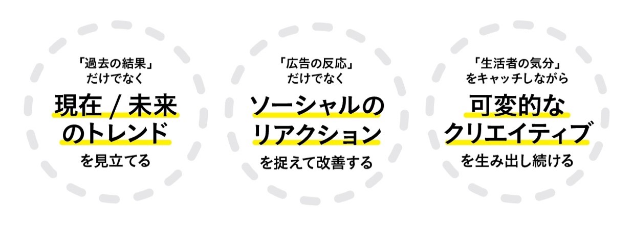 例えば、いま注目され始めているトレンドの兆しや、商品の意外な楽しみ方など、実際の行動データに基づいて生活者や社会の気分を捉えることで、メディア効果をより高めるクリエイティブを開発します。さらに、その結果を見ながらメディアの最適化はもちろん、クリエイティブや戦略の検証・アップデートを重ねていくことで成果の持続的向上へ導きます。