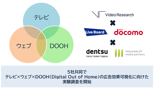 株式会社ビデオリサーチ(以下、ビデオリサーチ)、株式会社LIVE BOARD(以下、LIVE BOARD)、株式会社NTTドコモ(以下、ドコモ)、株式会社電通(以下、電通)、株式会社博報堂DYメディアパートナーズ(以下、博報堂DYメディアパートナーズ)は、「テレビ×ウェブ×デジタル屋外広告(Digital Out of Home、以下、DOOH)」のトリプルメディアにおける広告効果を可視化することを目的に、匿名かつユニークなIDである広告ID※1をキーとしたデータ連携などをすることで、どのメディア(テレビ、ウェブ、DOOH)でどの広告を見た人が、どのような意識変化や行動変容を起こしているかを把握する実証実験(以下、本実証実験)を2023年9月15日(金)から2024年3月29日(金)の期間で実施します。