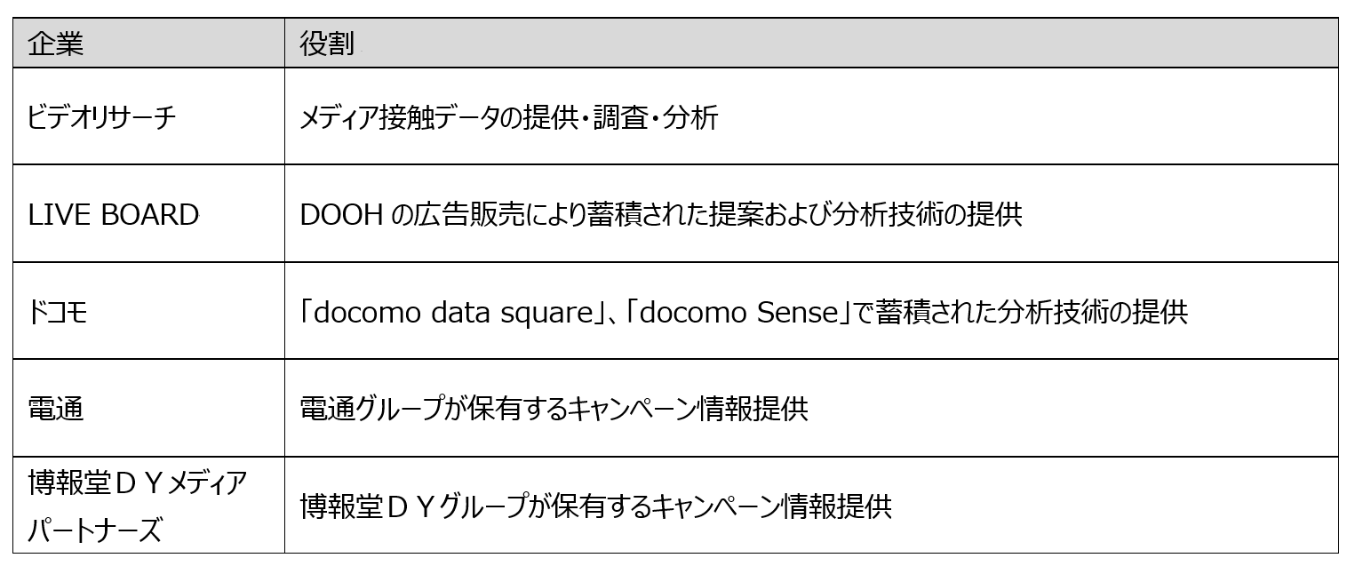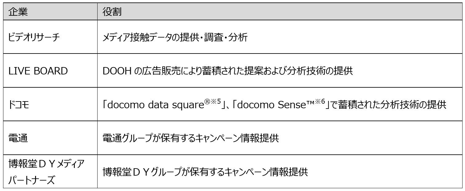 その結果を踏まえ、電通、博報堂DYメディアパートナーズが携わる実際のキャンペーン広告を「テレビ×ウェブ×DOOH」のトリプルメディアで表示し、DOOHへの接触が実際にどれだけの広告効果を示したのかを各社のキャンペーンごとに検証します。電通および博報堂DYメディアパートナーズがこれまで行ってきたキャンペーンの実施事例、LIVE BOARDのDOOHに特化した分析技術に、国内随一のテレビ視聴データを持つビデオリサーチの分析ノウハウをかけ合わせ、さらにドコモ独自のAI分析エンジンなどを活用することで、これまでの広告業界では表現できなかった新たな広告価値を見いだします。