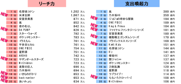 2019年調査における個別タイトル・アーティストに関するTop20ランキング(下表)を見ると、リーチ力ランキングでは米津玄師やあいみょんといった新顔アーティストが上位に急上昇していることがわかります。支出喚起力ランキングでは、昨年デビューしたばかりのKing & Princeが5位に。