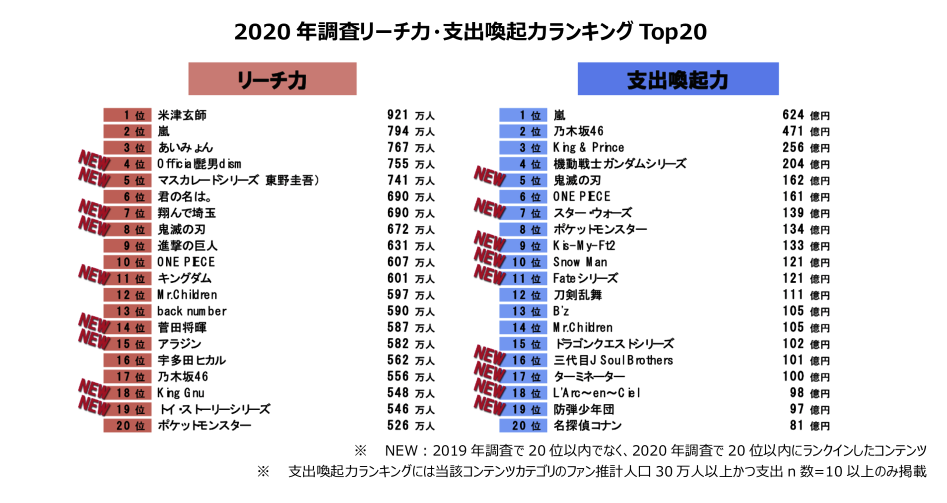※ NEW:2019年調査で20 位以内でなく、2020年調査で20位以内にランクインしたコンテンツ ※ 支出喚起力ランキングには当該コンテンツカテゴリのファン推計人口30 万人以上かつ支出 n 数=10 以上のみ掲載