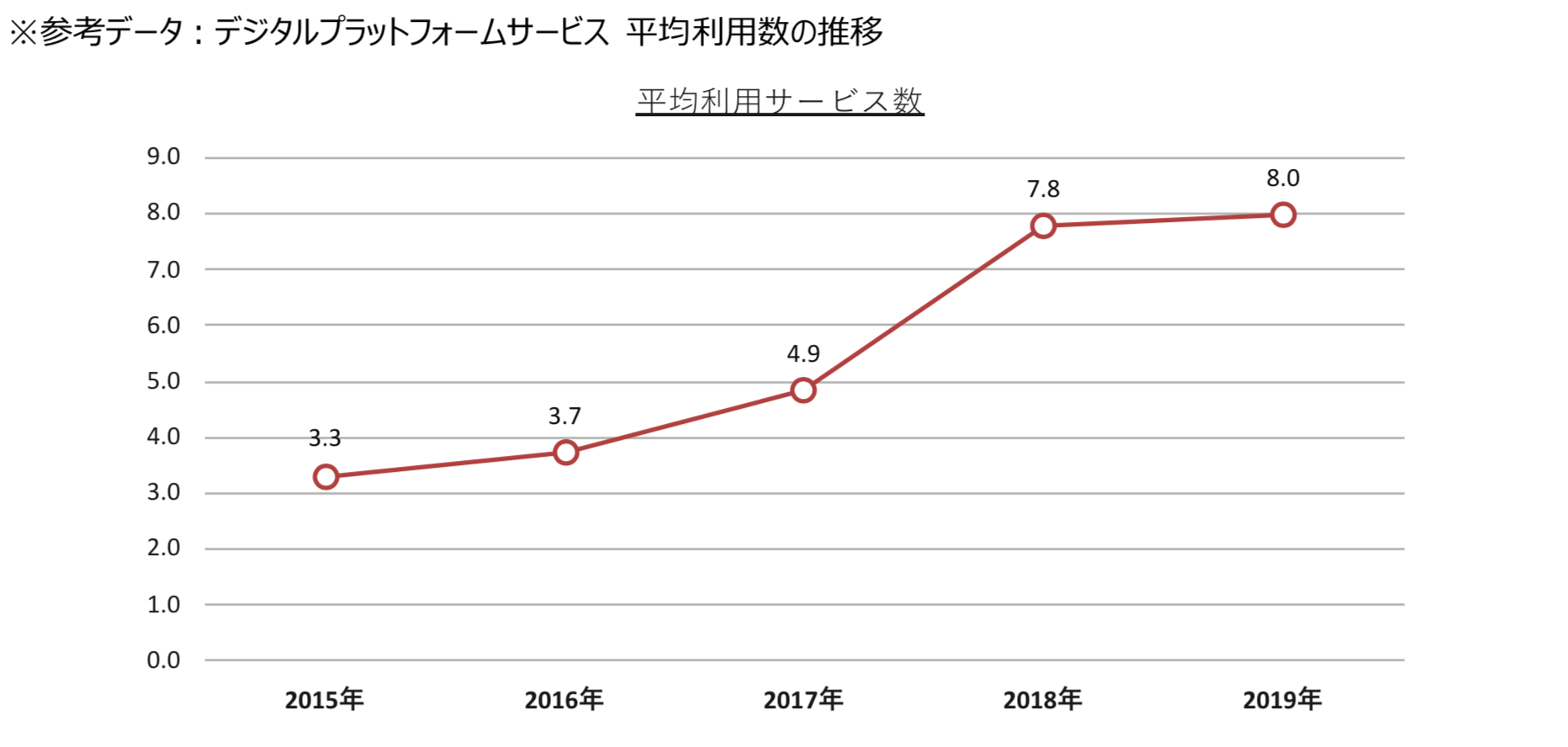 デジタルプラットフォームサービス(動画配信サービス、ラジオ、新聞・雑誌関連サービス、小説・漫画関連サービス、音楽配信サービス、 ゲーム、スポーツストリーミングサービス等)について、過去5年間の一人あたりの「平均利用サービス数」の推移を見ると、2015 年の Netflixのサービス開始、2016 年の Spotifyのサービス開始などを転換点に、直近では平均 8.0個と、生活者が利用するサービス 数は大きく伸⻑していることがわかります。