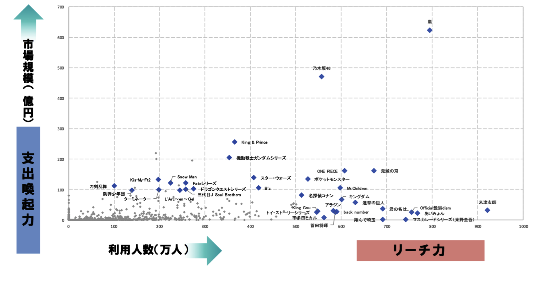 ・支出喚起力:コアファンによる、年間の関連市場規模の指標。自社の商品やサービスそのものにコンテンツを組み込んだオリジナルの企画を開発し、コンテンツファンの実際の購買を目的とする際に、どのくらいの売上規模が見込めるかを推計することができる。