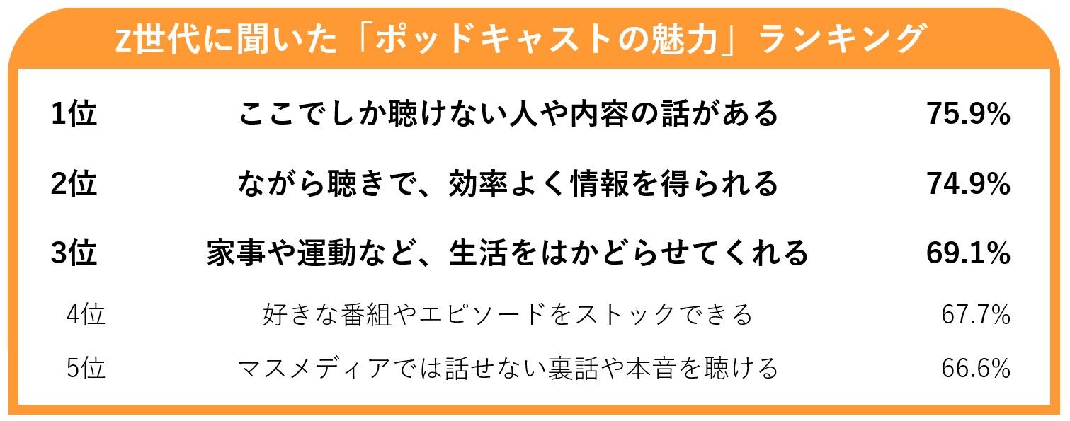 はかどらせてくれる」と音声の魅力があがる。5位には、1位のポッドキャストの独自性