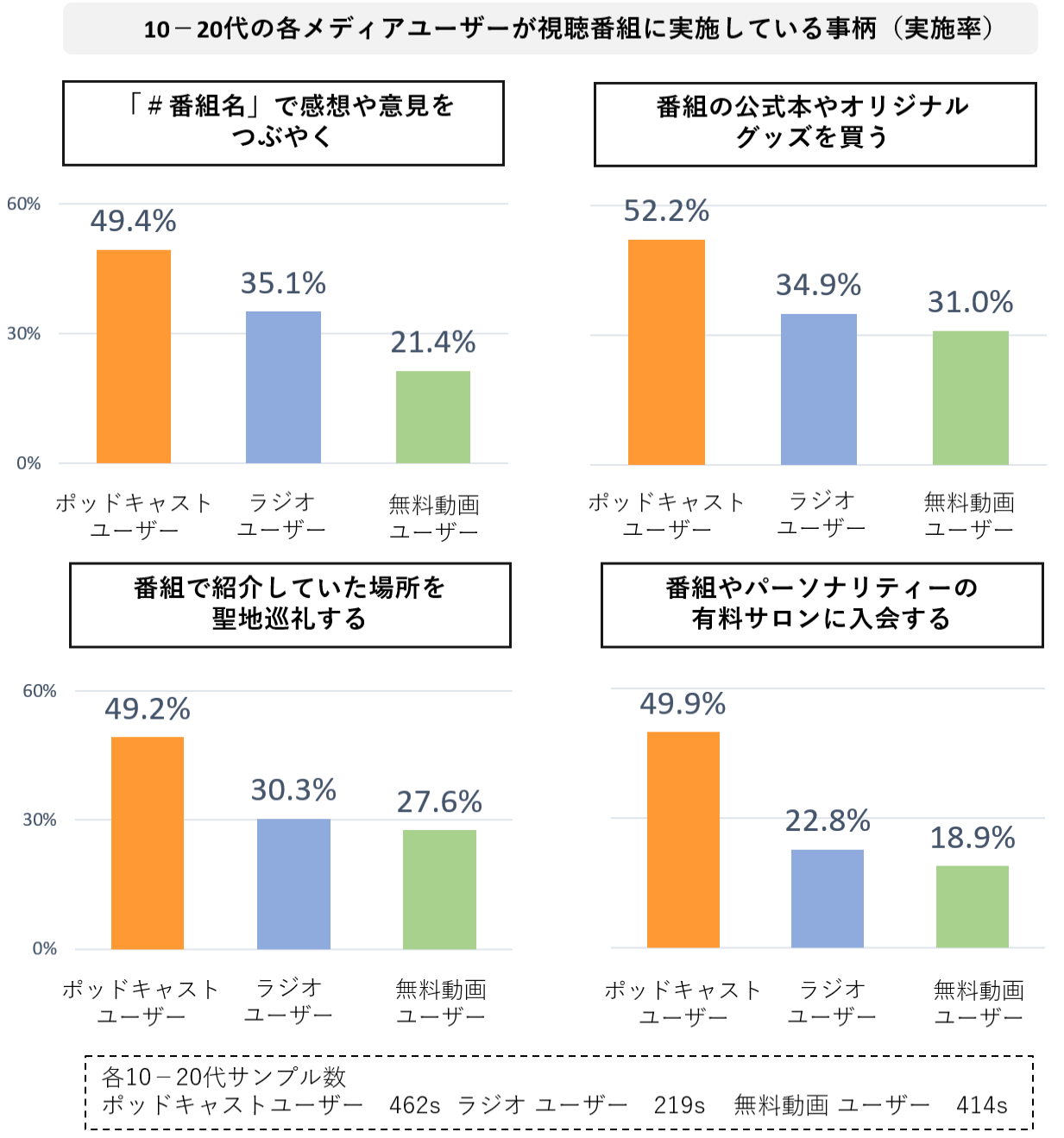 ③10-20代ユーザーの約半数が、聴くだけでなく「#番組名でつぶやく」のはもちろん、「番組の公式本やオリジナルグッズを買う」「番組のイベントに参加する」「番組やパーソナリティの有料サロンに入会する」など番組関連の消費にも積極的で、強いエンゲージメント力を有していることが明らかになった。