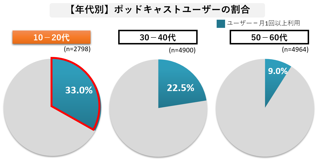 ① ポッドキャストユーザー(月1回以上聴取)は、10-60代で19.5%。