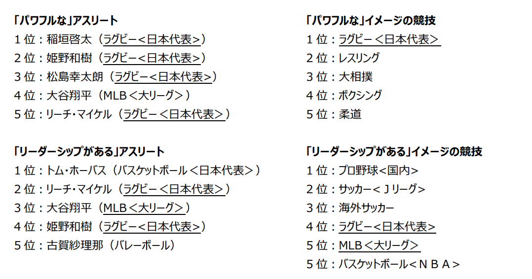 アスリートイメージ評価における個別イメージごとの上位5アスリートをランキングしました。競技も上位5競技のランキングを作成。「アスリート」と「競技」のイメージランキングを比較、共通して上位に挙がるものには下線を引きました。競技イメージとアスリートイメージで共通性があるものは関係を持つイメージ、共通性がないものはアスリート独自のイメージとして捉えています。
