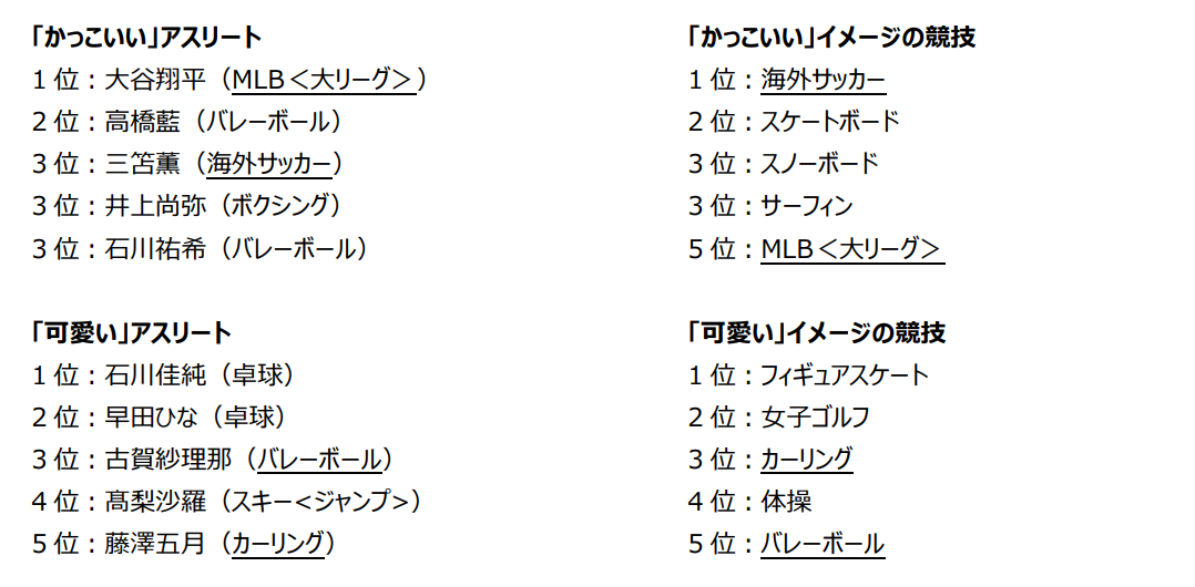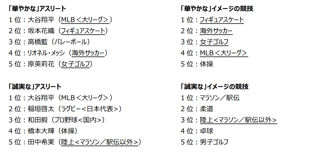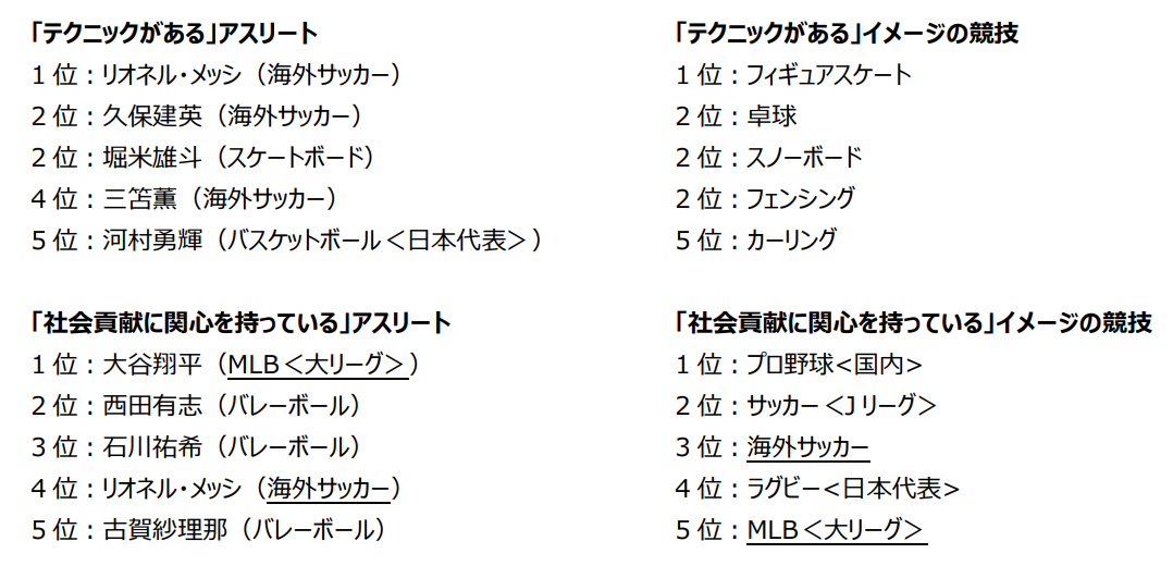 「華やかな」アスリートでは、1位:大谷翔平(MLB<大リーグ>)、2位:坂本花織(フィギュアスケート)、3位:高橋藍(バレーボール)、4位:リオネル・メッシ(海外サッカー)、5位:原英莉花(女子ゴルフ)でした。また、「可愛い」アスリートは、1位:石川佳純(卓球)、2位:早田ひな(卓球)、3位:古賀紗理那(バレーボール)、4位:髙梨沙羅(スキー<ジャンプ>)、5位:藤澤五月(カーリング)。「テクニックがある」アスリートは、1位:リオネル・メッシ(海外サッカー)、2位:久保建英(海外サッカー)、3位:堀米雄斗(スケートボード)、4位:三笘薫(海外サッカー)、5位:河村勇輝(バスケットボール<日本代表>)。「社会貢献に関心を持っている」アスリートは、1位:大谷翔平(MLB<大リーグ>)、2位:西田有志(バレーボール)、3位:石川祐希(バレーボール)、4位:リオネル・メッシ(海外サッカー)、5位:古賀紗理那(バレーボール)となりました。