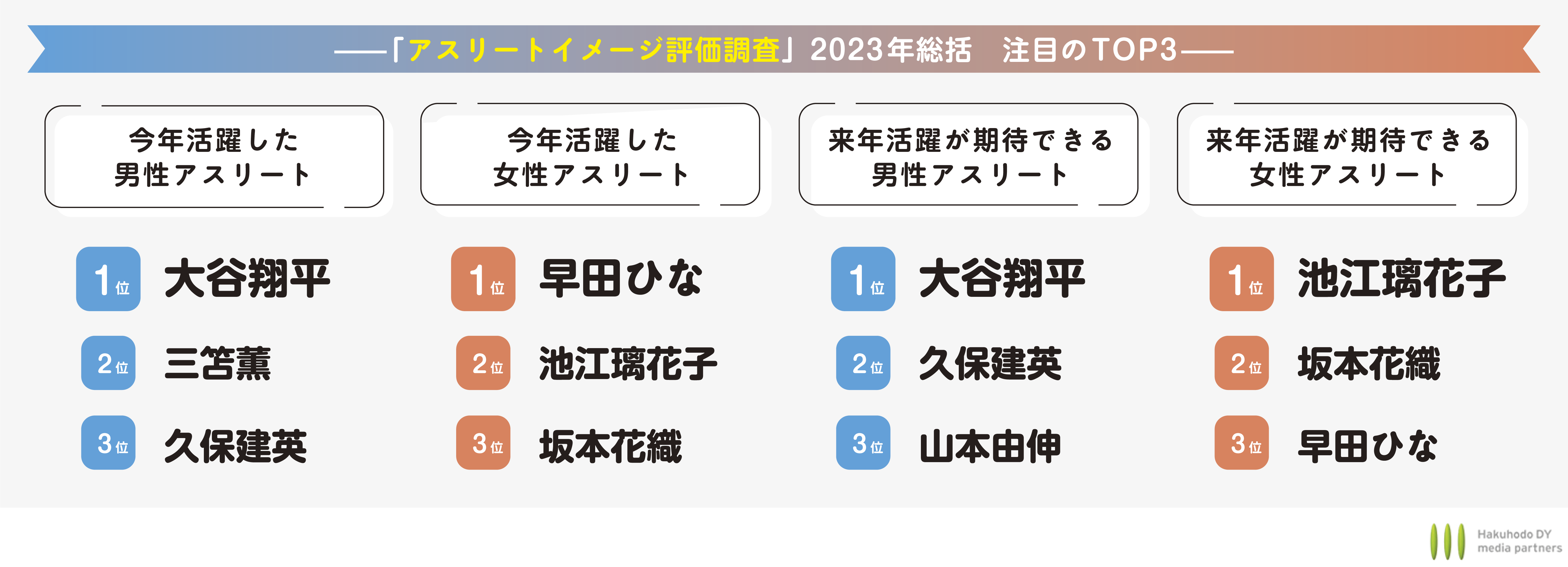 株式会社博報堂DYメディアパートナーズは、株式会社博報堂DYスポーツマーケティング、データスタジアム株式会社と共同で、2023年12月1日~5日に、アスリートの総合的なイメージを測定する「アスリートイメージ評価調査」2023年総括特別編を行いました。