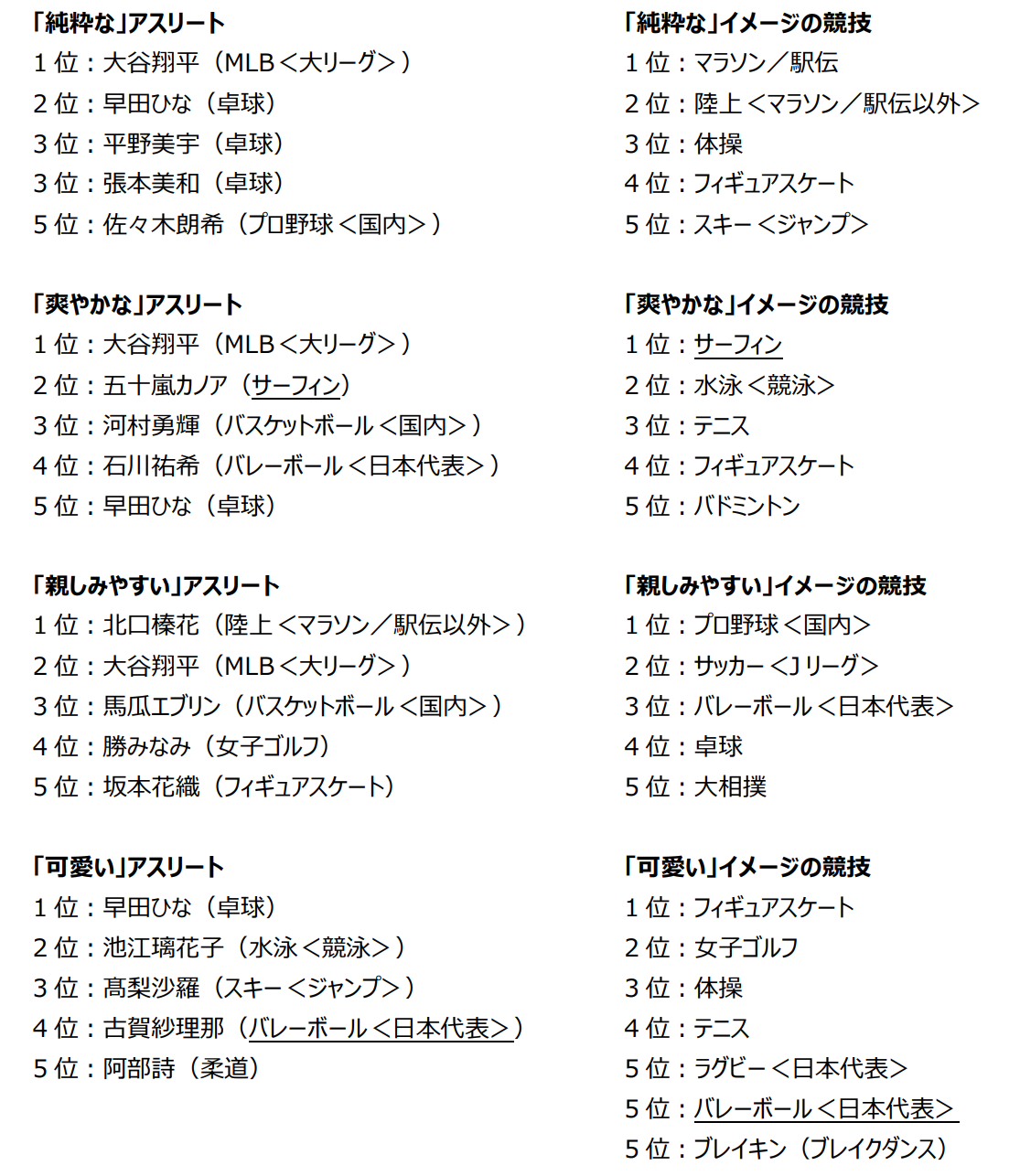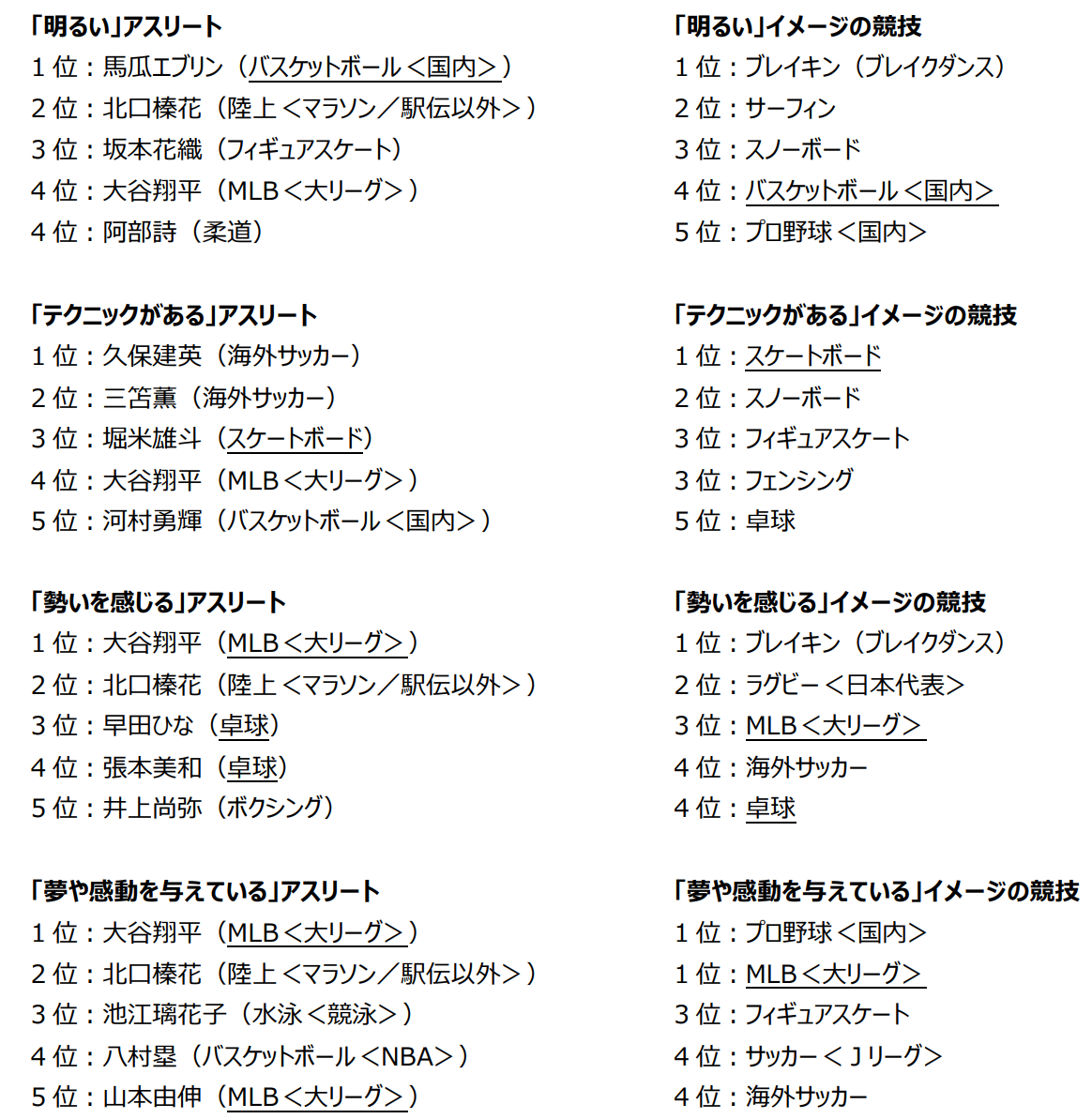 個別イメージでは、「純粋な」アスリートで1位:大谷翔平(MLB<大リーグ>)、2位:早田ひな(卓球)、3位:平野美宇(卓球)と張本美和(卓球)、5位:佐々木朗希(プロ野球<国内>)となりました。「爽やかな」アスリートは、1位:大谷翔平(MLB<大リーグ>)、2位:五十嵐カノア(サーフィン)、3位:河村勇輝(バスケットボール<国内>)、4位:石川祐希(バレーボール<日本代表>)、5位:早田ひな(卓球)、「夢や感動を与えている」は1位:大谷翔平(MLB<大リーグ>)、2位:北口榛花(陸上<マラソン/駅伝以外>)、3位:池江璃花子(水泳<競泳>)、4位:八村塁(バスケットボール<NBA>)、5位:山本由伸(MLB<大リーグ>)となりました。