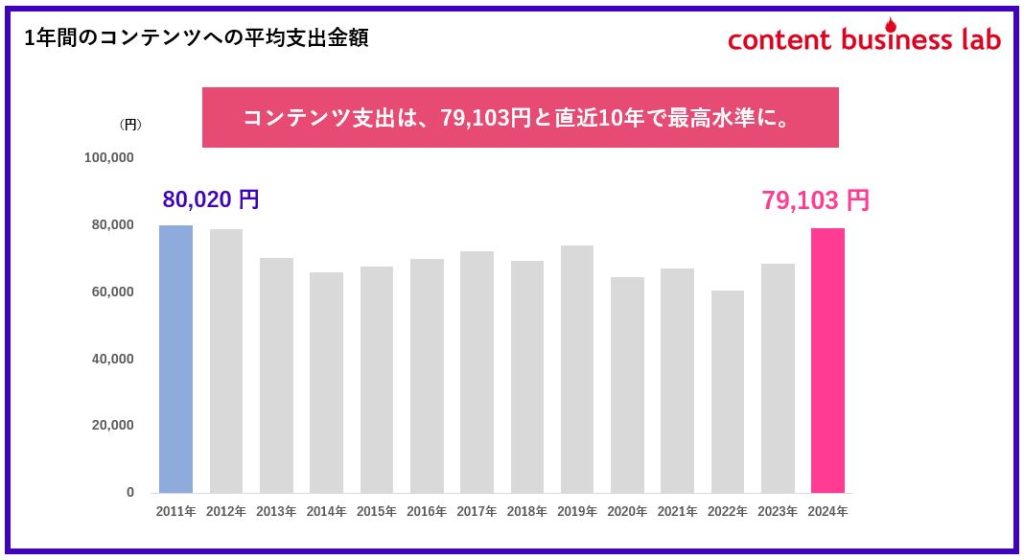 生活者のコンテンツへの支出金額は79,103円(前年比+10,576円)と、2011年の調査開始以来2番目に高い水準で、直近10年の調査結果では最高になりました(図1)。前年調査ではコロナ禍の落ち込みからの本格的な復調が見られましたが、今回の調査ではコロナ禍前の水準も超える高い伸びとなり、エンタメ市場の盛り上がりを示しています。