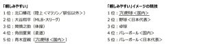 「アスリートイメージ評価調査」はCMキャスティングの際に使用する基礎データとしての活用を主な目的に、アスリートの認知度、好意度、29項目のイメージ評価によるオリジナル調査です。今後も定期的に実施し、分析を行ってまいります。